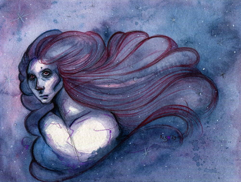 Watercolor and ink on roughly 8.5x11” , 140lb cold press watercolor paper. This piece was used to test new pigments/more wet-on-wet techniques and is without the white border typical of more intentional paintings. Price reflects this.